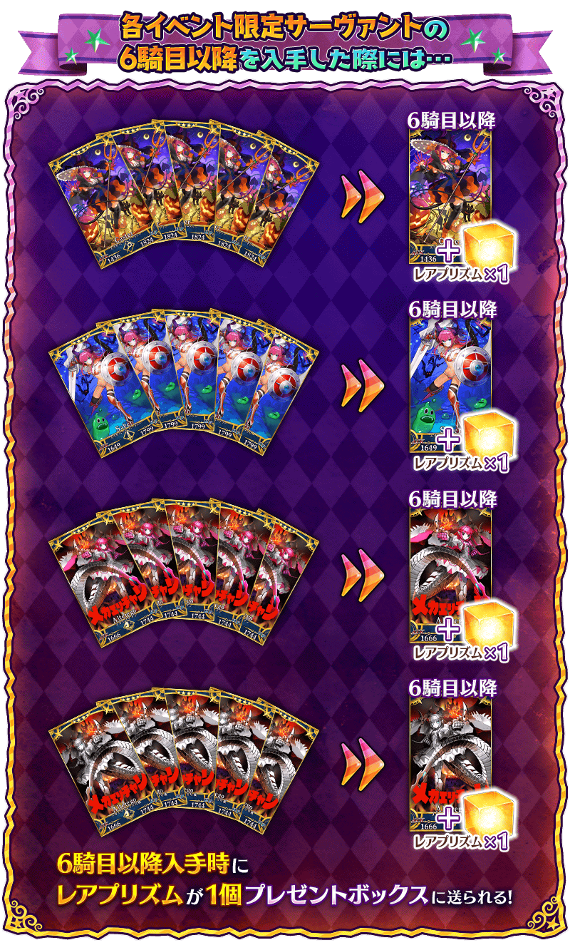 各イベント限定サーヴァントの6騎目以降を入手した際には、レアプリズム1個がプレゼントボックスに送られます。