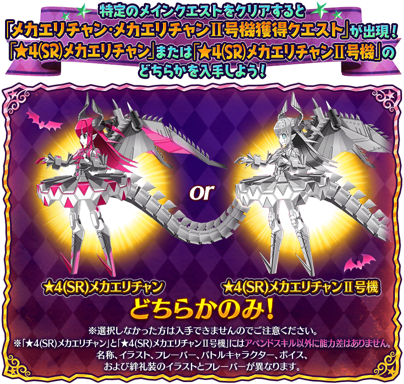 『【どちらかのみ!】「メカエリチャン」獲得クエスト』と『【どちらかのみ!】「メカエリチャンⅡ号機」獲得クエスト』にバトルはなく、どちらかのクエストを選んでクリアすると「★4(SR)メカエリチャン」または「★4(SR)メカエリチャンⅡ号機」のいずれかを獲得することができます。