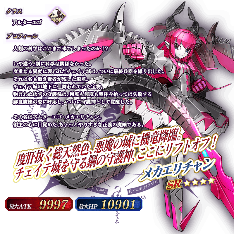 下記の期間中、「★4(SR)エリザベート・バートリー〔ブレイブ〕」「★4(SR)エリザベート・バートリー〔ハロウィン〕」「★4(SR)メカエリチャン」「★4(SR)メカエリチャンⅡ号機」を強化した際の獲得経験値が2倍になります。