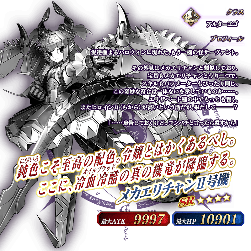 「★4(SR)エリザベート・バートリー〔ハロウィン〕」「★4(SR)エリザベート・バートリー〔ブレイブ〕」「★4(SR)メカエリチャン」「★4(SR)メカエリチャンⅡ号機」の宝具演出を紹介いたします!