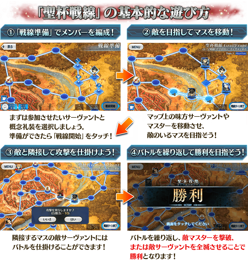 聖杯戦線は、敵味方に分かれたマスターとサーヴァントが、専用のバトルフィールドでバトルを繰り広げ、勝敗を争います。勝利することで聖杯の雫を1つ入手でき、7つ集めることで聖杯と交換可能になるので、すべての戦いを勝ち抜き、聖杯の獲得を目指しましょう!