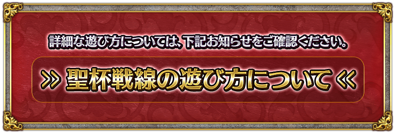 ※聖杯戦線のクリア報酬、戦利品、マスターEXP、魔術礼装EXP、絆ポイントを獲得できるのは初回クリア時のみです。 ※聖杯戦線で発生するバトルはミッションの達成条件に含まれません。 ※聖杯戦線は、開放されているものであれば任意の順番でプレイすることが可能です。 ※聖杯戦線を開戦した場合、その戦いが終わるまでは「強化」「召喚」等、聖杯戦線以外のことはできませんのであらかじめご注意ください(バトルの途中でも「戦線離脱」を選択して聖杯戦線の選択画面に戻ることはできますが、聖杯戦線はやり直しとなります)。 ※「戦線離脱」を選択して聖杯戦線の選択画面に戻った場合、聖杯戦線開始時に消費したAPは戻ってきませんのでご注意ください。