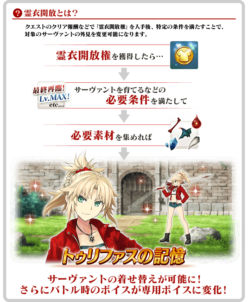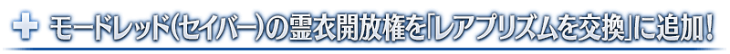 ※「★5(SSR)モードレッド(セイバー)」を未所持の場合、霊衣開放権は入手可能となりますが、霊衣開放はおこなえませんのでご注意ください。