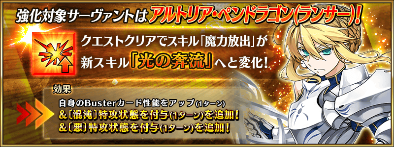 「★5(SSR)アルトリア・ペンドラゴン(ランサー)」「★4(SR)トリスタン」が強化される特別なクエスト「サーヴァント強化クエスト」が、カルデアゲートに恒常的に追加されます。