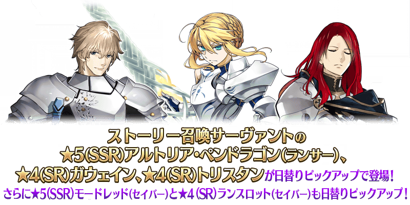 ★5 アルトリア・ペンドラゴン(ランサー) ストーリー召喚サーヴァント ★5 モードレッド(セイバー) ★4 ガウェイン ストーリー召喚サーヴァント ★4 ランスロット(セイバー) ★4 トリスタン ストーリー召喚サーヴァント |