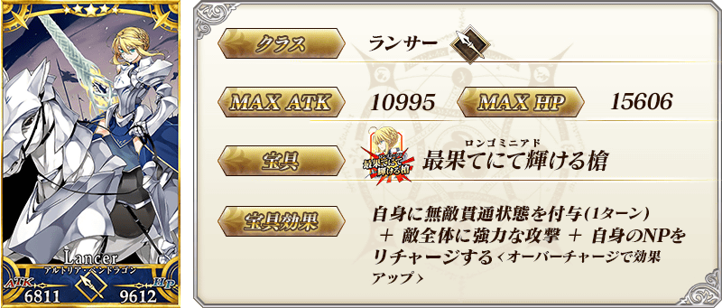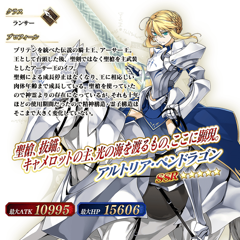 ※上記の「★5(SSR)アルトリア・ペンドラゴン(ランサー)」のイラストは霊基再臨第2段階のものです。