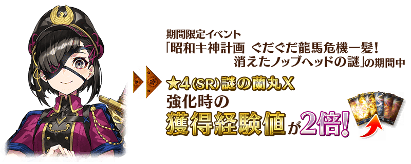 本イベントの期間中は、「★4(SR)謎の蘭丸X」を強化した際の獲得経験値が2倍になります。