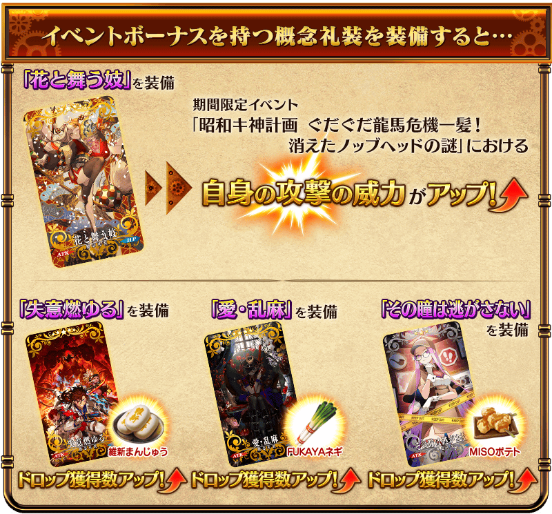 さらに、聖晶石召喚にてピックアップされる期間限定概念礼装「★5(SSR)失意燃ゆる」「★4(SR)愛・乱麻」「★3(R)その瞳は逃がさない」を装備することで、イベントアイテム「維新まんじゅう」「FUKAYAネギ」「MISOポテト」それぞれのドロップ獲得数がアップします。