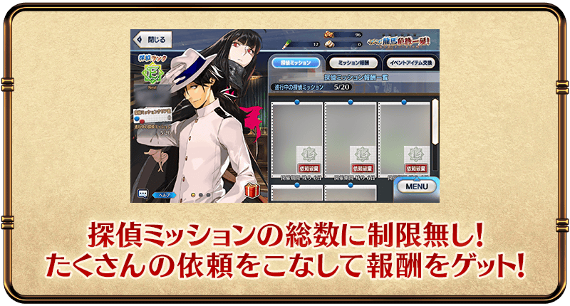 本イベントでは、ストーリーを楽しめるメインクエストが日ごとに開放されるほか、メインクエスト第壱話クリア後には「探偵ミッション」が開放されます。