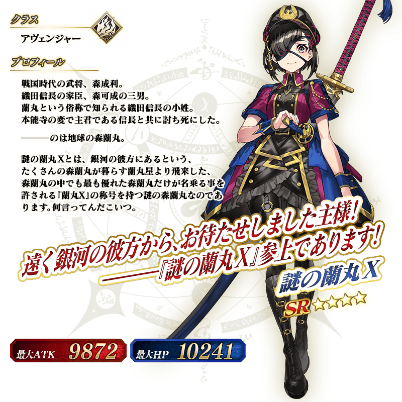 本イベントではメインクエストを進行すると、イベント限定サーヴァント「★4(SR)謎の蘭丸X」が期間限定で仮加入します。 メインクエストを進めて、「★4(SR)謎の蘭丸X」を正式加入させましょう!