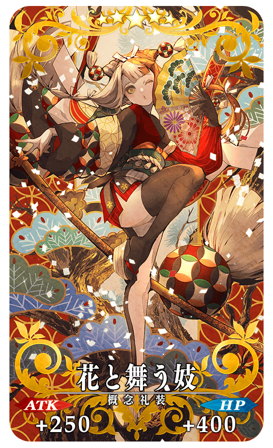 イベントアイテム交換で入手できるイベント限定概念礼装「★5(SSR)花と舞う妓」を装備すると、期間限定イベント「昭和キ神計画 ぐだぐだ龍馬危機一髪! 消えたノッブヘッドの謎」における自身の攻撃の威力がアップします。