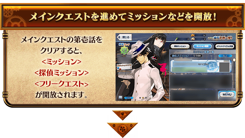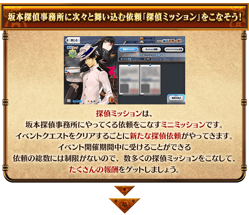 本イベントでは、ストーリーを楽しめるメインクエストが日ごとに開放されるほか、メインクエスト第壱話クリア後には「探偵ミッション」が開放されます。