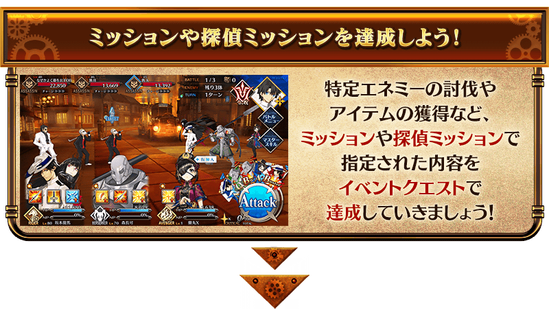 期間限定イベント「昭和キ神計画 ぐだぐだ龍馬危機一髪! 消えたノッブヘッドの謎」では、「特定のアイテムを一定数以上集める」「特定のエネミーを倒す」など、さまざまな条件を達成することで、豪華報酬を獲得できるミッションが発生します!