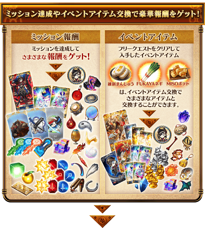 【イベント限定概念礼装】 【霊衣開放権】 【サーヴァントコイン】 【スキル強化&霊基再臨素材】 【霊基再臨素材】 【その他アイテム】 |