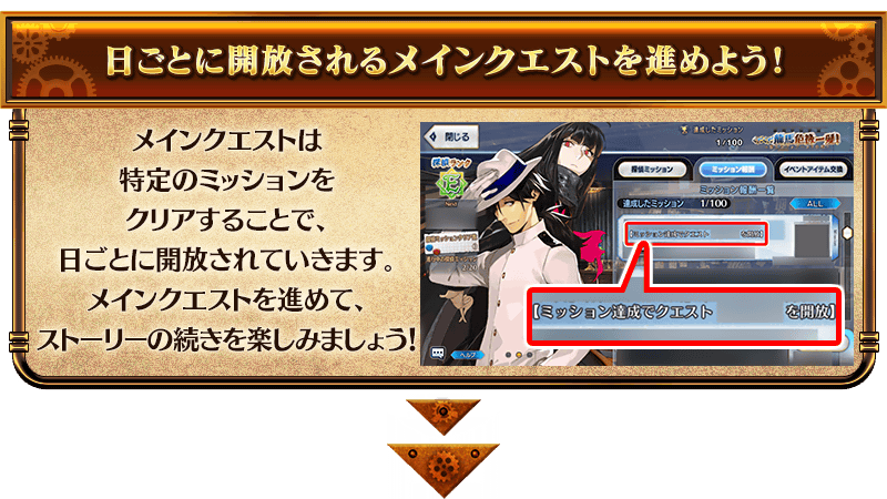 ストーリーを楽しめるメインクエストは、特定のミッションを達成していると日ごとに開放されます。 メインクエストをクリアすることで、イベント限定サーヴァント「★4(SR)謎の蘭丸X」が正式加入します。 さらに、メインクエストを進めると新たなフリークエストの追加や、探偵ミッションの難易度と報酬がグレードアップします。