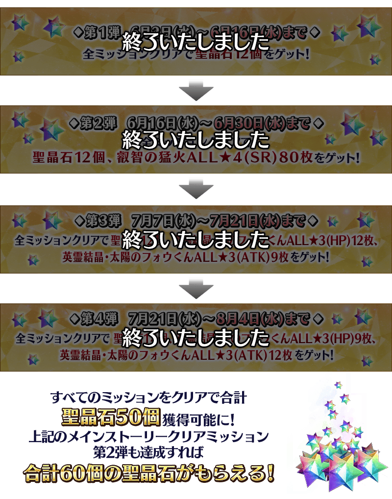 第4弾のすべてのミッションをクリアすると、聖晶石14個(聖晶石召喚最大4回分)、英霊結晶・星のフォウくんALL★3(HP)9枚、英霊結晶・太陽のフォウくんALL★3(ATK)12枚をゲットできます!