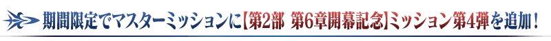 下記の期間中、「マスターミッション」の「限定」タブ内に期間限定で「【第2部 第6章開幕記念】ミッション」が追加されます。
