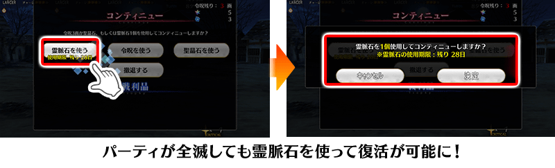 令呪3画、もしくは聖晶石を消費することなくバトルに復帰することができますので、メインストーリーでの強敵とのバトルにぜひご活用ください!