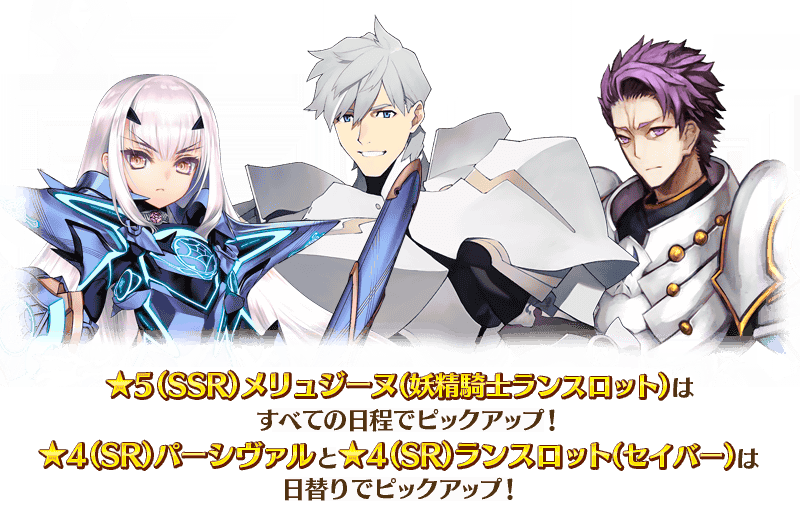 ※「★5(SSR)メリュジーヌ(妖精騎士ランスロット)」は、「妖精騎士ランスロット」を霊基再臨第2段階にすることで名称が「メリュジーヌ」に変化します。