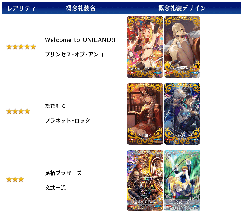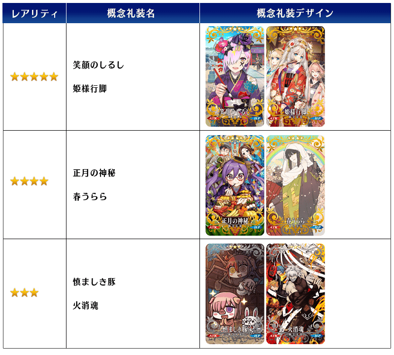排出される概念礼装は2018年4月開催の「Fate/Apocrypha×Fate/Grand Orderスペシャルイベントピックアップ召喚」から、2019年12月開催の「クリスマス2019ピックアップ召喚(日替り)」までに登場した期間限定概念礼装となります。