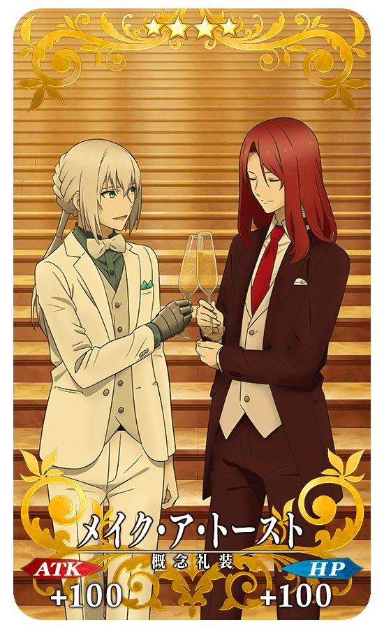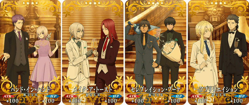 ※『「劇場版 Fate/Grand Order -神聖円卓領域キャメロット- Paladin; Agateram」公開直前キャンペーン』限定概念礼装は全4枚あり、それぞれ1週間ごとに入れ替ります。 ※最大で4種すべてを入手可能ですが、各期間内にログインできなかった場合、該当期間のキャンペーン限定概念礼装は入手不可となりますのでご注意ください。 ※各期間内に受け取り条件を満たせなかった場合においても、該当期間のキャンペーン限定概念礼装は入手不可となりますのでご注意ください。