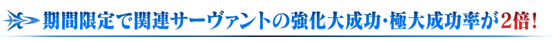 下記の期間中、「劇場版 Fate/Grand Order -神聖円卓領域キャメロット-」関連サーヴァントの強化をおこなった際に、大成功(経験値2倍ボーナス)・極大成功(経験値3倍ボーナス)の発生率が期間限定で2倍になります!