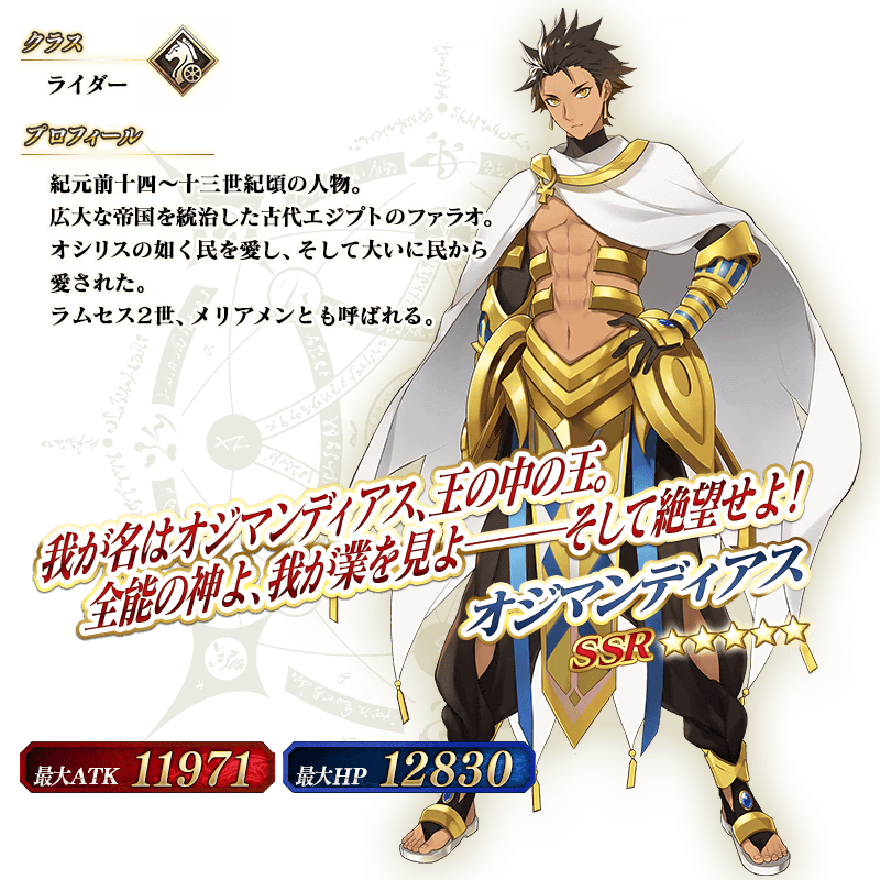 ※上記の「★5(SSR)オジマンディアス」のイラストは霊基再臨第2段階のものです。