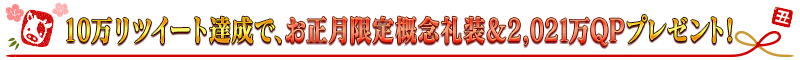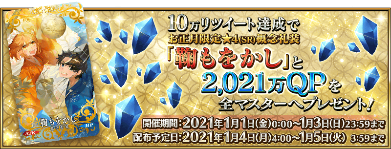 公式ツイッターの上部に固定表示されている「2021年お正月キャンペーン開催!」ツイートのリツイート数が、下記の期間内で10万リツイートを達成すると、ゲームをプレイしているすべてのマスターに「★4(SR)鞠もをかし」と2,021万QPをプレゼント!