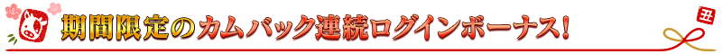 ※1回目のカムバック連続ログインボーナスは2020年12月31日(木) 22:00以降より配布されます。 ※以降のカムバック連続ログインボーナスは、各日4:00に配布されます。 ※連続ログイン日数が途切れてしまった時点で、以降のプレゼントは受け取れません。 ※最大で7回受け取り可能ですが、プレゼント対象となったタイミングによっては、この限りではございません。