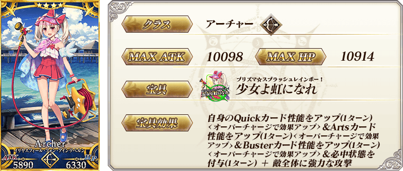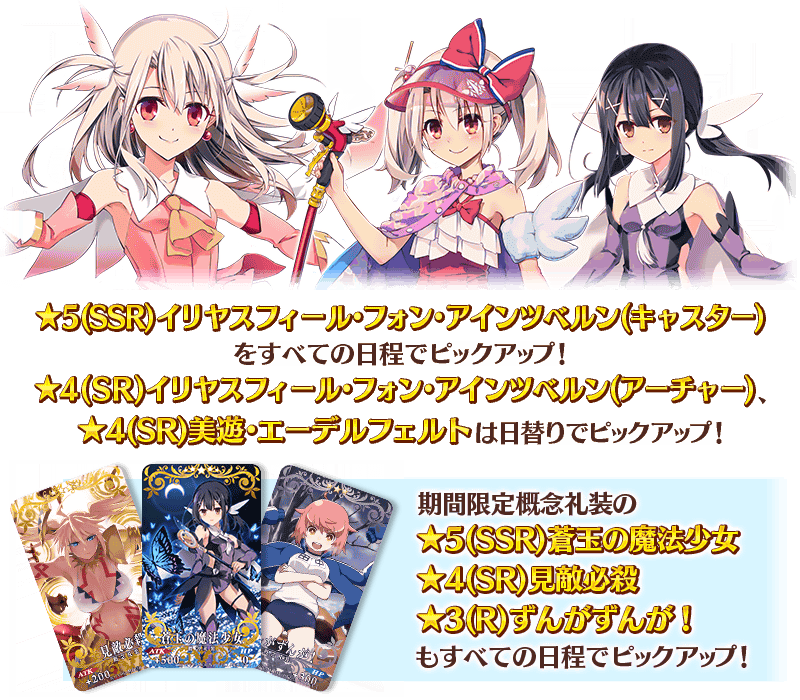 【日替りピックアップ(対象日のみ召喚可能)】 ・★4(SR)イリヤスフィール・フォン・アインツベルン(アーチャー) ・★4(SR)美遊・エーデルフェルト