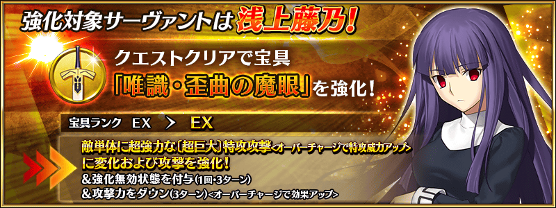 「★4(SR)浅上藤乃」が強化される特別なクエスト「サーヴァント強化クエスト」が、カルデアゲートに恒常的に追加されます。