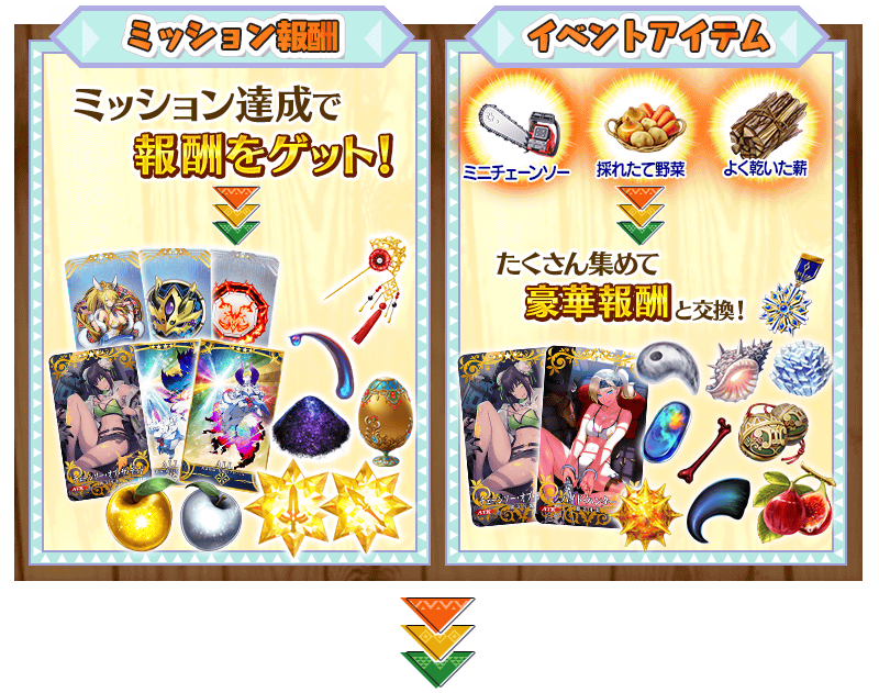 聖晶石召喚にてピックアップされる期間限定概念礼装「★5(SSR)ハニー・レイク」「★5(SSR)イノセント・ブルー」「★4(SR)ハッピー☆ドライブ」「★4(SR)クライミング・バトル」「★3(R)ホラー・コンシェルジュ」「★3(R)マブダチ・バーベキュー」を装備することで、イベントアイテム「ミニチェーンソー」「採れたて野菜」「よく乾いた薪」それぞれのドロップ獲得数がアップします。