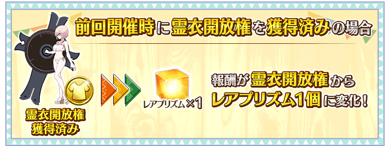 なお、2020年に開催された期間限定イベント「サーヴァント・サマーキャンプ! ~カルデア・スリラーナイト~」で霊衣開放権を獲得している場合、霊衣開放権に代わりレアプリズムを獲得できます。