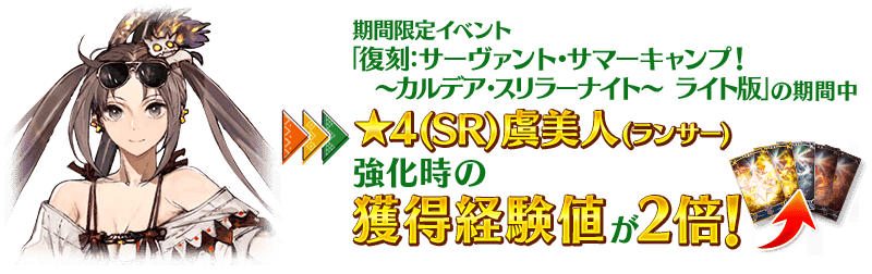 本イベントの期間中は、「★4(SR)虞美人(ランサー)」を強化した際の獲得経験値が2倍になります。