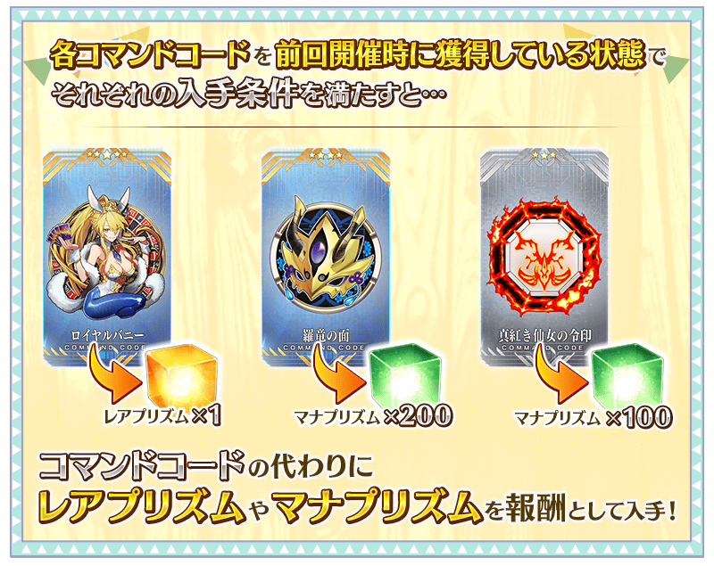 2020年に開催された期間限定イベント「サーヴァント・サマーキャンプ! ~カルデア・スリラーナイト~」で同じコマンドコードを獲得している場合、コマンドコードに代わりレアプリズムまたはマナプリズムを獲得できます。