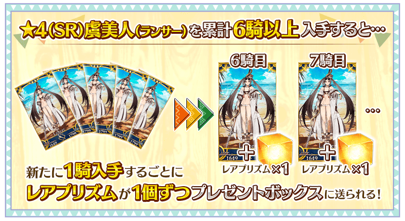 「★4(SR)虞美人(ランサー)」を「累計で6騎以上」入手すると、6騎目以降、新たに1騎入手するごとにレアプリズム1個がプレゼントボックスに送られます。