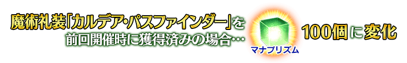 ・前回開催時に魔術礼装「カルデア・パスファインダー」を獲得している場合、本イベントでは魔術礼装「カルデア・パスファインダー」の代わりに「マナプリズム」を獲得できます。