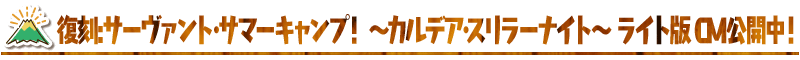 「Fate/Grand Order」公式サイト内トップページにて、期間限定イベント「復刻:サーヴァント・サマーキャンプ! ~カルデア・スリラーナイト~ ライト版」のTVCMを公開しております。