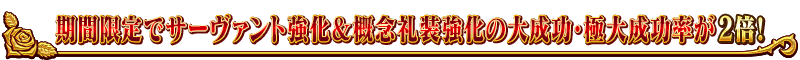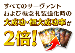 下記の期間中、サーヴァントおよび概念礼装の強化をおこなった際に、大成功(経験値2倍ボーナス)・極大成功(経験値3倍ボーナス)の発生率が期間限定で2倍になります!