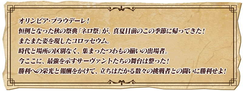 ◆前回開催時および「霊衣縫製」「レアプリズムを交換」にて対象の霊衣を獲得している場合のご注意◆ 2017年に開催された期間限定イベント「ネロ祭再び ~2017 Autumn~」および「霊衣縫製」「レアプリズムを交換」にて「★4(SR)ネロ・クラウディウス(セイバー)」の霊衣「オリンピアの体操服」を獲得済みの場合、以下のように変化いたします。 ・前回開催時にイベント報酬で「霊衣開放権」を獲得している場合、本イベントの賞品抽選で「霊衣開放権」に代わりレアプリズムを獲得できます。 ・「霊衣縫製」および「レアプリズムを交換」にて対象の霊衣を交換していた場合、本イベントにて対象の霊衣を入手した際にレアプリズム5個がプレゼントボックスに返還されます。