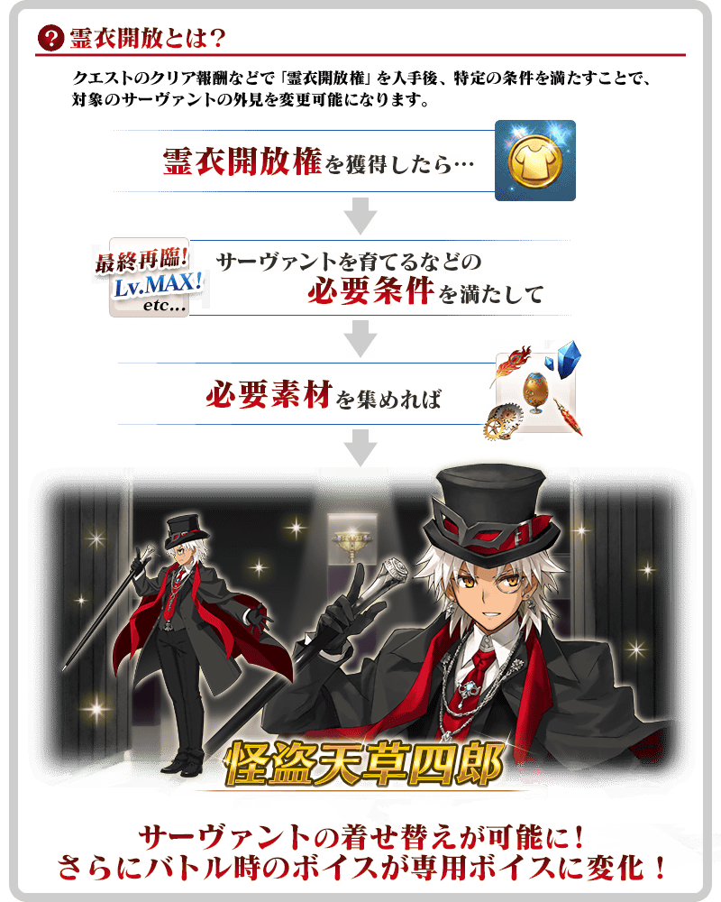 ※「★5(SSR)天草四郎」の霊衣開放権は、期間限定イベント「聖杯怪盗天草四郎 ~スラップスティック・ミュージアム~」のイベントアイテム交換期間のみ入手可能です。