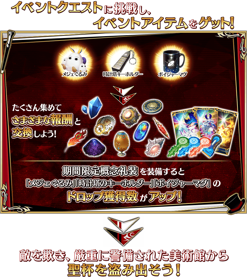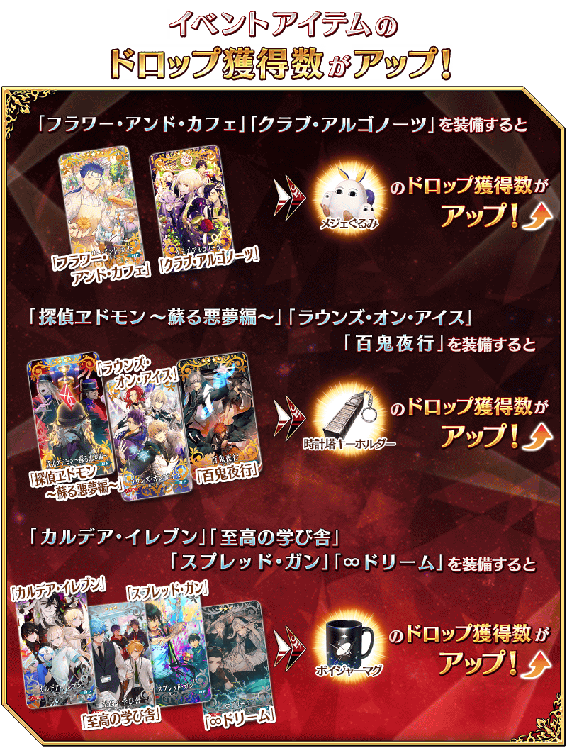 聖晶石召喚にてピックアップされる期間限定概念礼装「★5(SSR)フラワー・アンド・カフェ」「★5(SSR)クラブ・アルゴノーツ」「★4(SR)探偵ヱドモン~蘇る悪夢編~」「★4(SR)ラウンズ・オン・アイス」「★4(SR)百鬼夜行」「★3(R)カルデア・イレブン」「★3(R)至高の学び舎」「★3(R)スプレッド・ガン」「★3(R)∞ドリーム」を装備することで、イベントアイテム「メジェぐるみ」「時計塔キーホルダー」「ボイジャーマグ」それぞれのドロップ獲得数がアップします。