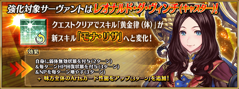 「★5(SSR)レオナルド・ダ・ヴィンチ(キャスター)」「★5(SSR)天草四郎」「★3(R)荊軻」が強化される特別なクエスト「サーヴァント強化クエスト」が、カルデアゲートに恒常的に追加されます。