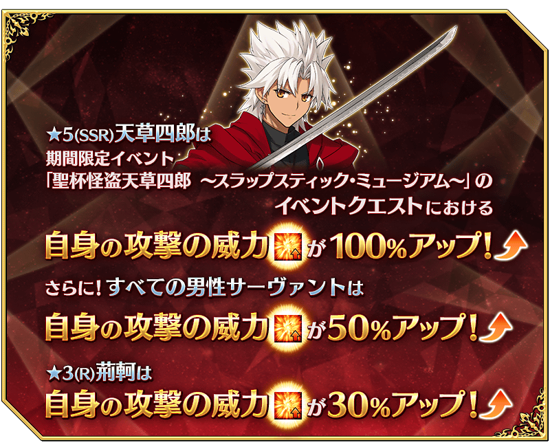 さらに、「★5(SSR)天草四郎」以外のすべての男性サーヴァントはイベントクエストにおける「自身の攻撃の威力が50%アップ」、「★3(R)荊軻」は「自身の攻撃の威力が30%アップ」のボーナスをそれぞれ得られます!