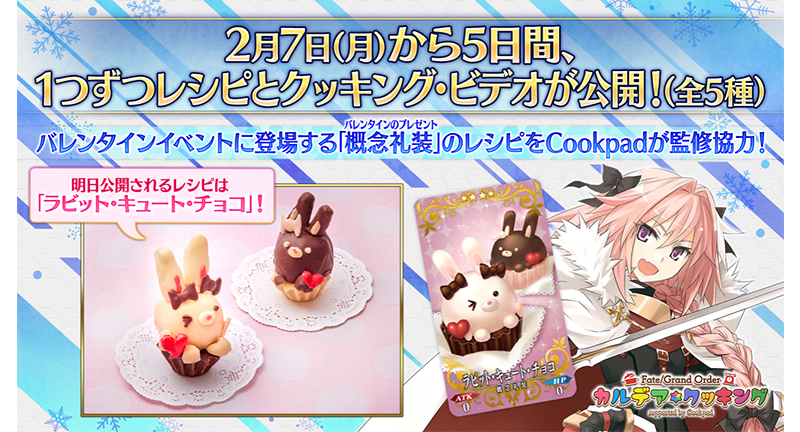 バレンタインイベントで登場する「概念礼装(バレンタインのプレゼント)」のレシピをCookpadより監修協力いただき、2月7日(月)から5日間、1つずつレシピおよびクッキング・ビデオを公開するキャンペーンを実施いたします。