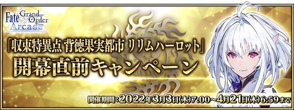 「収束特異点 背徳果実都市 リリムハーロット」の最新情報は、3月13日(日)より配信予定の「Fate/Grand Order Arcade カルデア・アーケード放送局 Vol.9 カルデアバトルトーナメント2022冬 決勝大会&収束特異点 開幕直前SP」にて公開予定となります。