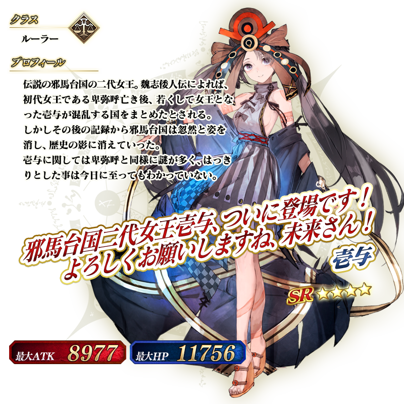 期間限定イベント「ぶっちぎり茶の湯バトル ぐだぐだ新邪馬台国 地獄から帰ってきた男」のストーリーを進めることで、イベント限定サーヴァント「★4(SR)壱与」を正式加入させることができます。
