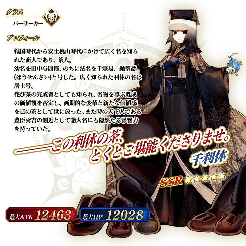 ※上記の「★5(SSR)千利休」のイラストは霊基再臨第2段階のものです。