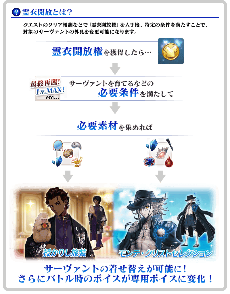 ※「★5(SSR)巌窟王 エドモン・ダンテス」「★5(SSR)アルジュナ」の霊衣は、外見とともに一部ボイスが変化します。