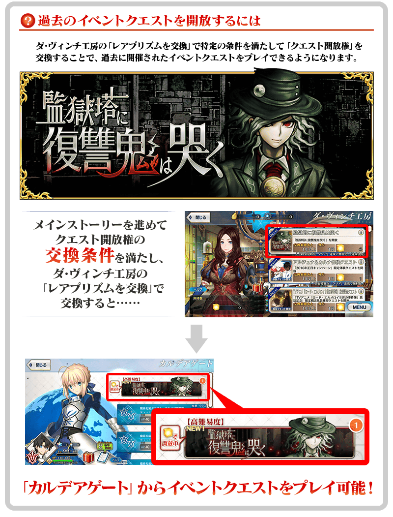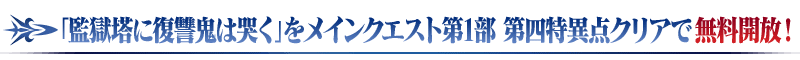 ダ・ヴィンチ工房の「レアプリズムを交換」にて開放できる高難易度のイベント「監獄塔に復讐鬼は哭く」のクエストが、メインクエスト第1部 第四特異点をクリアすることで無料開放できるようになりました!